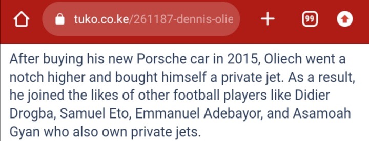 Oliech went one step further in 2015 and purchased a private plane after purchasing his new Porsche vehicle. He consequently joined the ranks of football stars who also own private aircraft, such Didier Drogba, Samuel Etoo, Emmanuel Adebayor, and Asamoah Gyan.