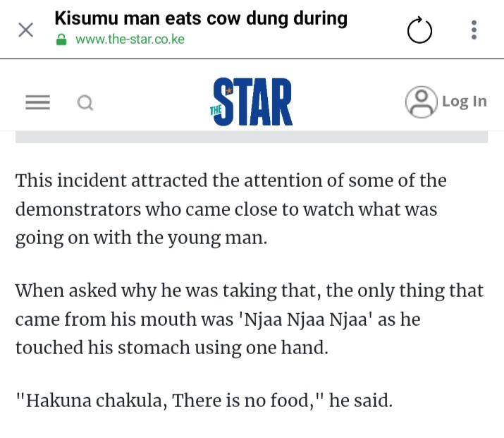 A Frustrated Kenyan citizen during the mass demonstrations in support of their party leader Raila Odinga on Friday in Kisumu was pictured munching on cow dung and juice.