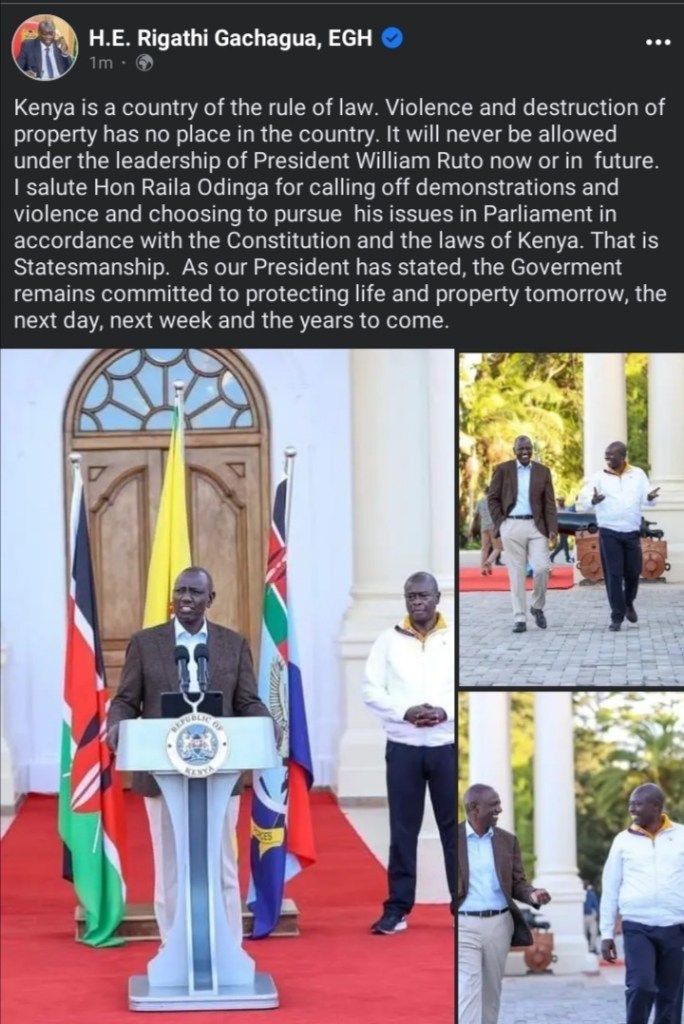 “Kenya is a country of the rule of law. Violence and destruction of property has no place in the country. It will never be allowed under the leadership of President William Ruto now or in future. I salute Hon Raila Odinga for calling off demonstrations and violence and choosing to pursue his issues in Parliament in accordance with the Constitution and the laws of Kenya. That is Statesmanship. As our President has stated, the Goverment remains committed to protecting life and property tomorrow, the next day, next week and the years to come.” Gachagua’s post reads.