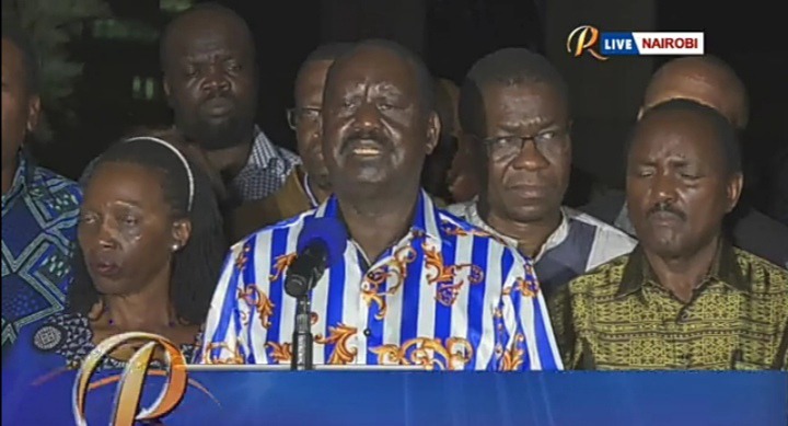 Photo courtesy: Raila Odinga with Azimio la umoja Politicians while adresssing the nation